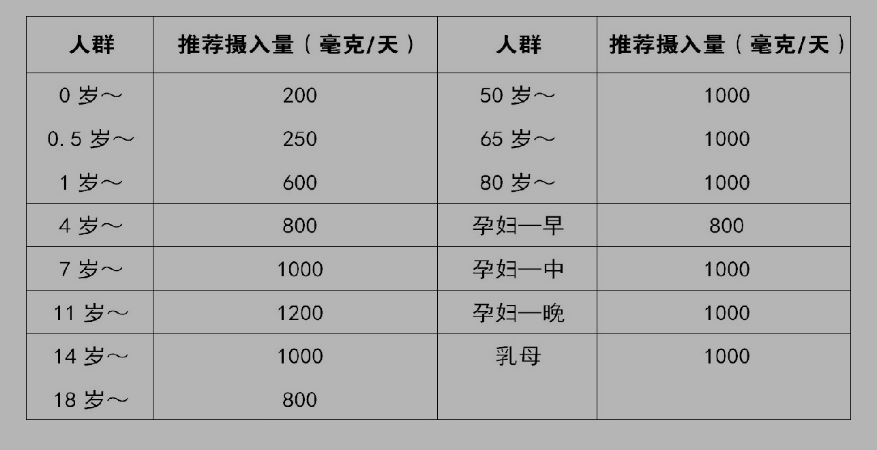 大家可以參考我國(guó)居民膳食指南推薦每日鈣攝入量(如上表)。