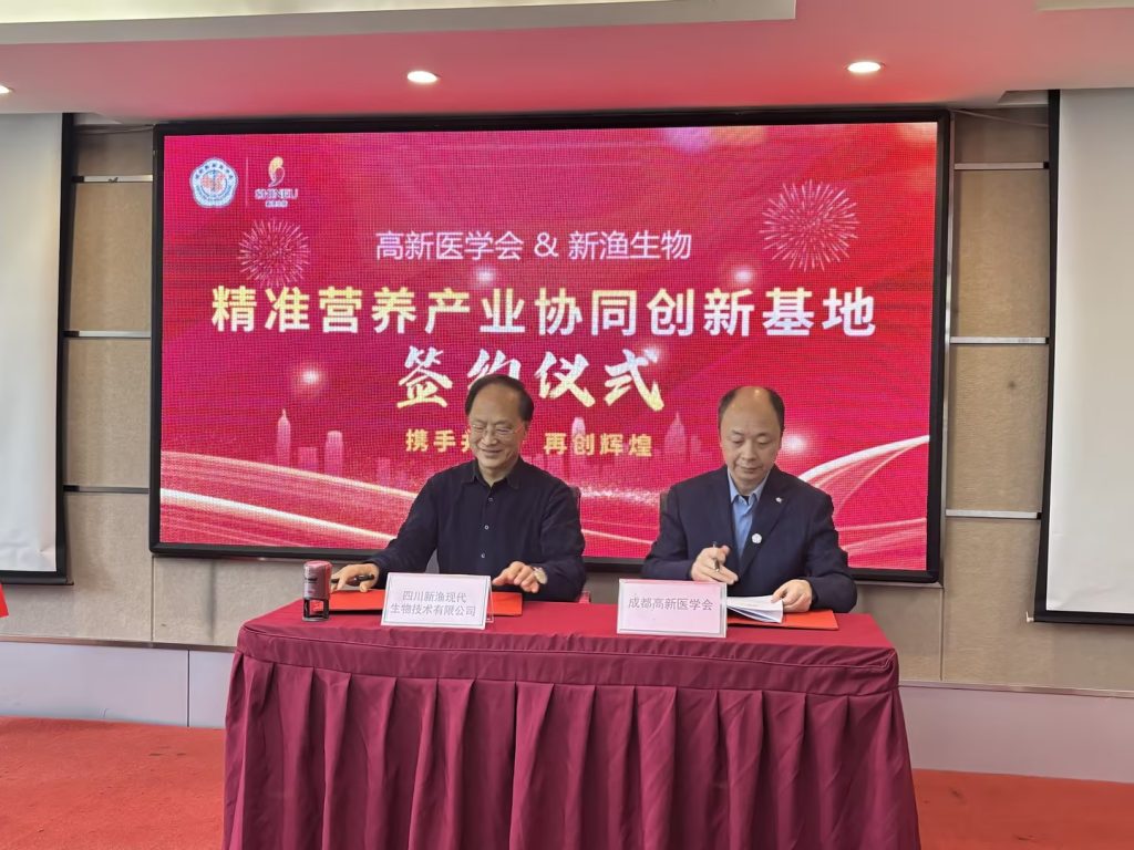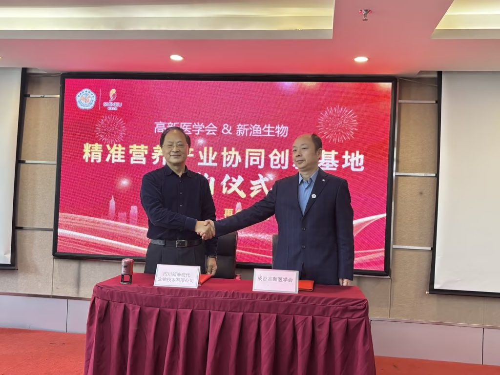簽約儀式上,成都高新醫(yī)學(xué)會(huì)醫(yī)工融合協(xié)同創(chuàng)新中心馮懷志主任和四川新漁現(xiàn)代生物技術(shù)有限公司董事長馬建中分別致辭,表達(dá)了雙方對(duì)此次合作的高度重視和美好愿景,隨后雙方代表共同簽署了合作協(xié)議。簽約儀式結(jié)束后還舉行了成都高新醫(yī)學(xué)會(huì)精準(zhǔn)營養(yǎng)產(chǎn)業(yè)協(xié)同創(chuàng)新基地的授牌儀式。